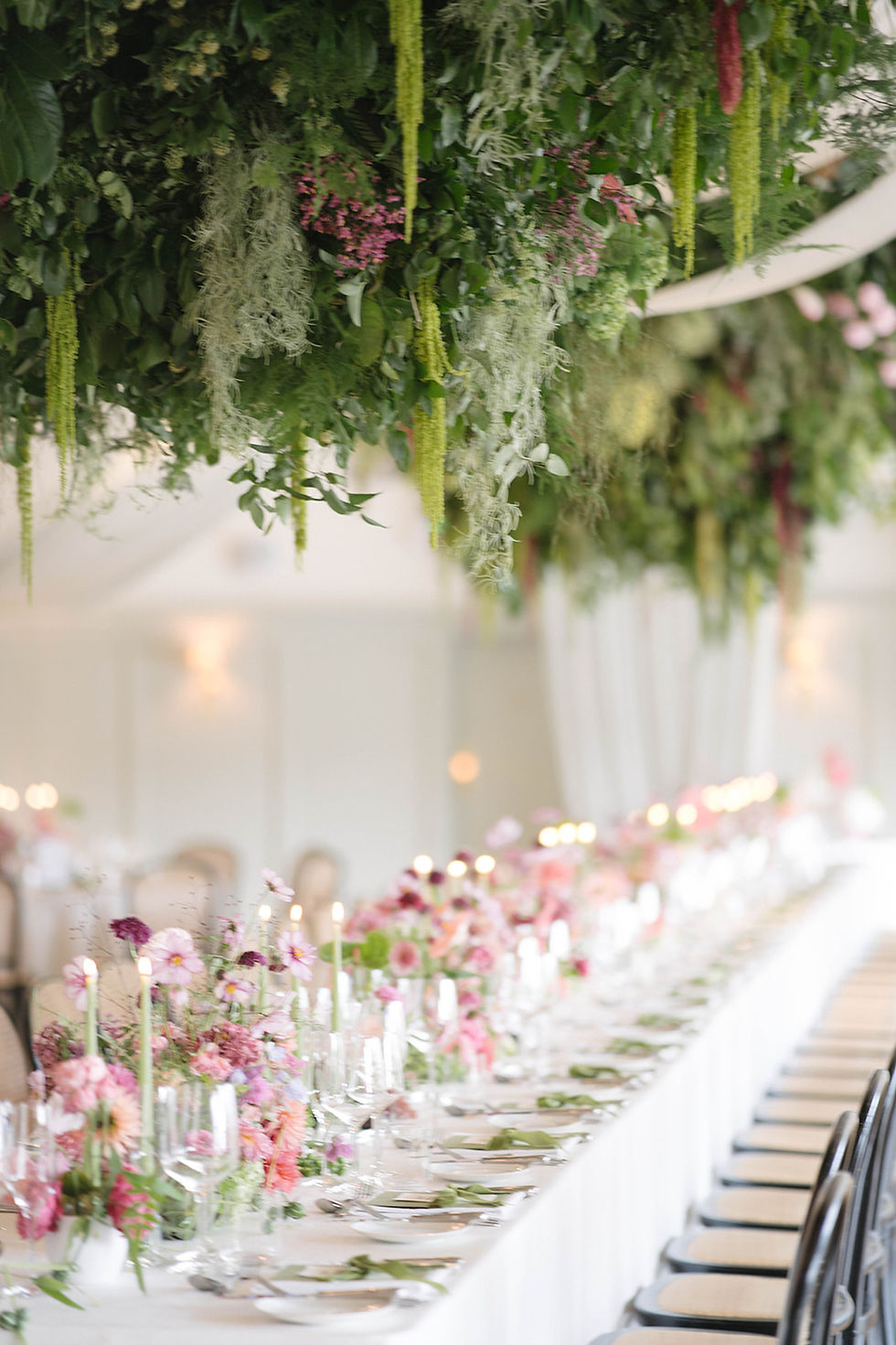 Clear span marquee in the family garden overlooking the South Downs, decorated with greenery and Chrystal chandeliers. We wanted to bring the outside in, the existing flower beds were incorporated into the seating plan and so natural feel to the florals was important. Katie chose the very elegant white and green colour scheme and wanted an organic relaxed feel but still elegant and refined.